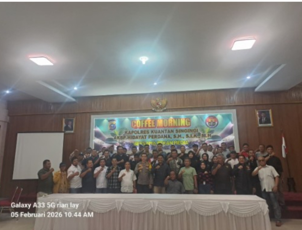 TELUK KUANTAN – Suasana di Aula Satnika Satyawada Polres Kuantan Singingi (Kuansing) tampak berbeda pagi ini, Kamis (05/02/2026). Tidak ada ketegangan formal yang kaku; yang ada justru aroma kopi yang harum dan gelak tawa akrab antara aparat kepolisian dan kuli tinta.