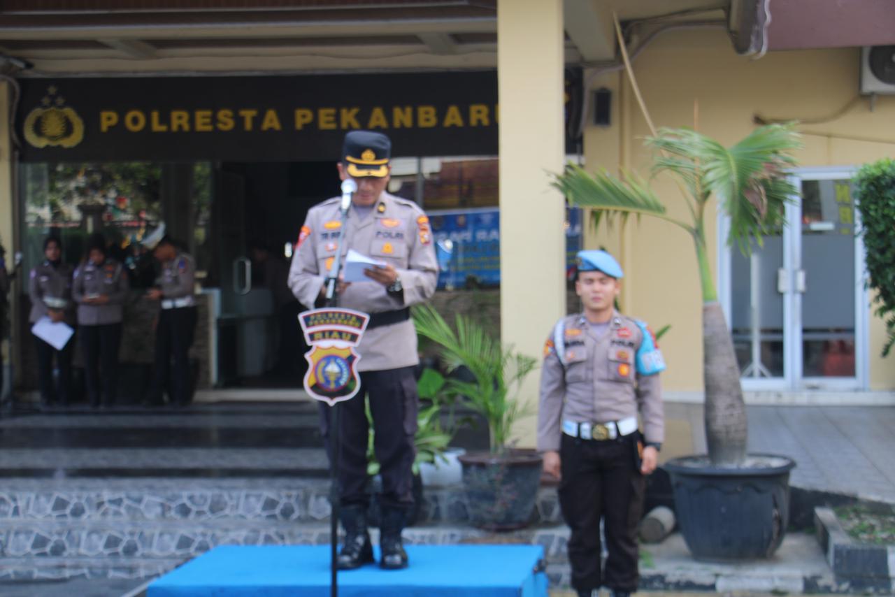 Kabag Ops Polresta Pekanbaru Kompol Tri Budiyanto, S.H., S.I.K., menyampaikan bahwa Apel Gelar Pasukan merupakan tahapan penting untuk memastikan kesiapan personel sebelum pelaksanaan operasi di lapangan.